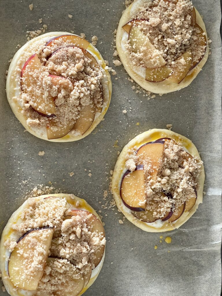 Ein Eigelb mit etwas Milch vermischen und jeden Taler damit bestreichen. In die Mitte jeweils etwa einen Esslöffel vom Griesspudding geben. Die Pflaumen nach Lust und Laune auf dem Taler verteilen, Streusel darüber geben und am Schluss noch etwas Zimt-Zucker auf den Taler streuen. Das gibt den Talern noch einen schönen süßen extra Crunch.