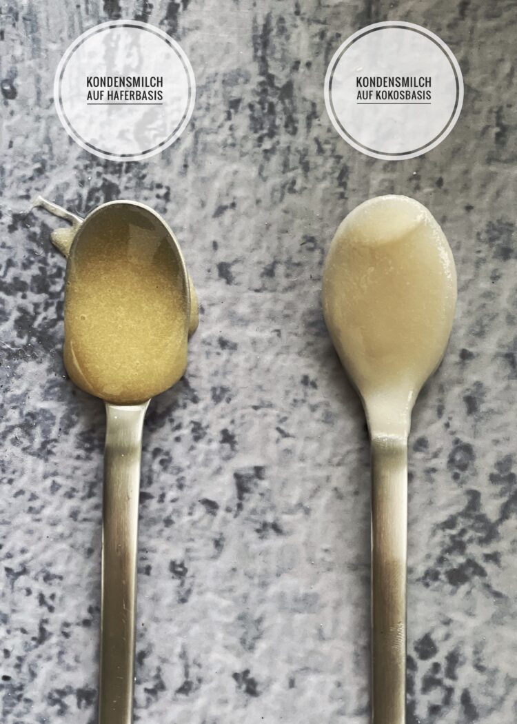 Die erste vegane Kondensmilch ist auf Hafermilchbasis mit Cashewmus. Die Süße bekommt sie durch den Puderzucker. Sie ist zudem in weniger als fünf Minuten fertig und kann sofort verwendet werden.